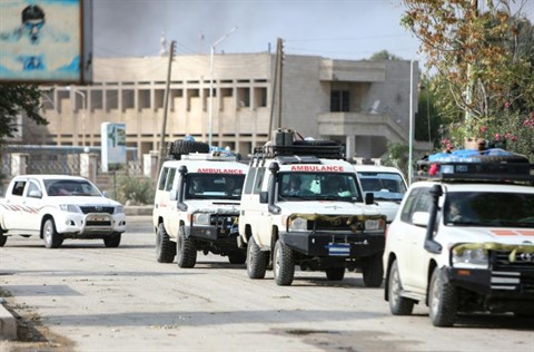 | Un convoi d'ambulances et de véhicules évacuant des blessés et des combattants kurdes quitte la ville de Ras al-Aïn, le 20 octobre en Syrie. |
