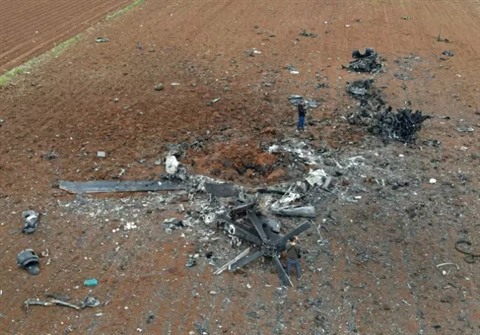 | Vue aérienne des débris d'un hélicoptère des forces spéciales américaines, dans le village de Jinderes, le 3 février en Syrie. |