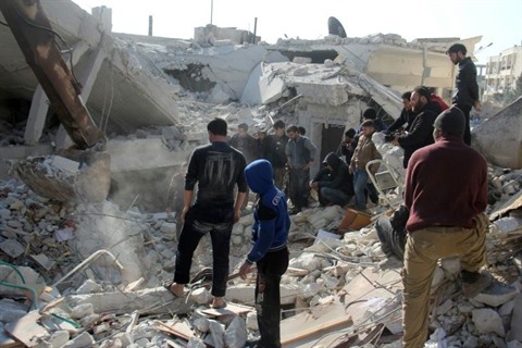 | Des syriens recherchent des survivants dans les décombres d'un immeuble, le 7 février à Idleb. |