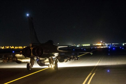 | Photo fournie par l'Établissement de Communication et de Production Audiovisuelle de la Défense (ECPAD) française montrant un avion de combat Rafale décollant des Émirats arabes unis pour bombarder Raqa. |