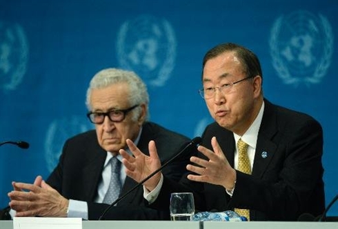| Le secrétaire général de l'ONU, Ban Ki-moon (droite) et l'émissaire spécial pour la Syrie, Lakhdar Brahimi lors d'une conférence de presse sur la réunion Genève II sur la Syrie, le 22 janvier à Montreux. |