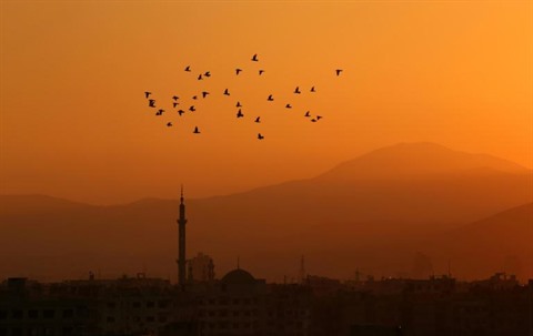 | Coucher du soleil à Arbin, le 7 mars dans la région de la Ghouta orientale, à l'est de Damas. |