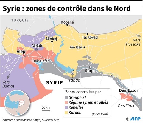 Ces zones ne concernent pas les trois provinces totalement sous contrôle du régime (Damas, Tartous et Sweida) ainsi que l'Est et le Nord-Est du pays où se trouvent les jihadistes de l'EI et la coalition kurdo-arabe qui les combat avec l'appui des États-Unis.