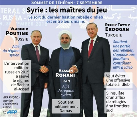 Iran, Russie et Turquie ont échoué vendredi 7 septembre à surmonter leurs divergences, tout en convenant de continuer à "coopérer" en vue d'une solution pour éviter les pertes civiles dans cette région du Nord-Ouest de la Syrie, autour de laquelle le pouvoir de Bachar al-Assad amasse des troupes en vue d'un assaut qui semble imminent.