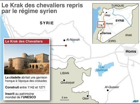 | Carte et données sur le Krak des Chevaliers repris par les forces gouvernementales syriennes. Photo : AFP/VNA/CVN |
