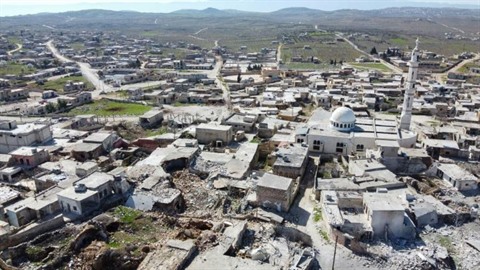 | Vue aérienne du village de Kansafra, dans la province d'Idleb, dans le Nord-Ouest de la Syrie, le 8 mars. |