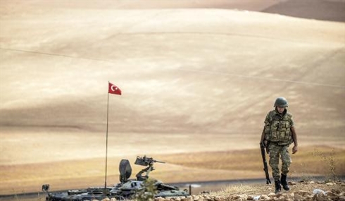 | Un soldat turc patrouille près de la frontière syrienne, à proximité de la ville de Suruc en Turquie, le 30 septembre |