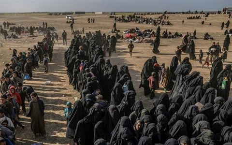 | Des femmes et des enfants évacués de Baghouz sont pris en charge par les Forces démocratiques syriennes, le 5 mars dans la province de Deir Ezzor. |
