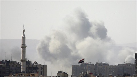 | De la fumée venant du camp de réfugiés palestiniens à Yarmouk, au sud de Damas, le 20 avril. |