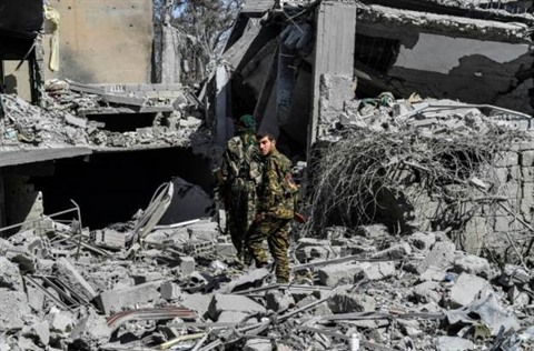 | Des combattants des Forces démocratiques syriennes au milieu des décombres d'immeubles démolis, le 8 octobre à Raqa, en Syrie. |