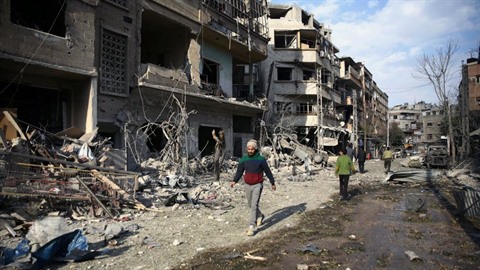 | Une rue de Douma après un bombardement aérien, dans la Ghouta orientale. |
