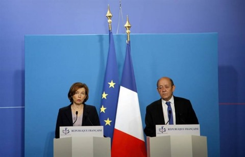 | Les ministres des Affaires étrangères Jean-Yves Le Drian et des Armées Florence Parly s'expriment sur les frappes en Syrie depuis l'Élysée, le 14 avril. |