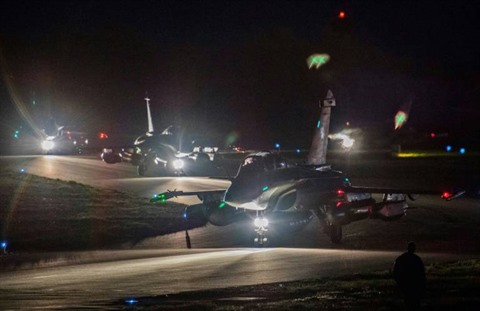 | Photo fournie par le service de presse de l'armée française d'avions Rafale se préparant à décoller depuis la base de Saint-Dizier, le 13 avril, pour une mission en Syrie. |