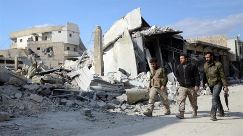 | Des rebelles syriens dans une rue d'Al-Bab, le 24 février 2017. |