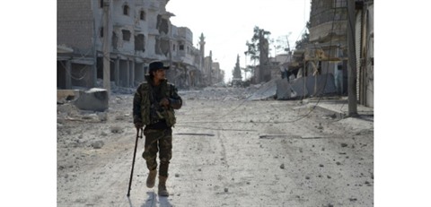 | Un rebelle syrien marche dans la ville de al-Bab le 24 février 2017. |