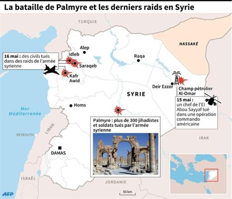 | Carte de la Syrie localisant les derniers raids et la bataille de Palmyre |