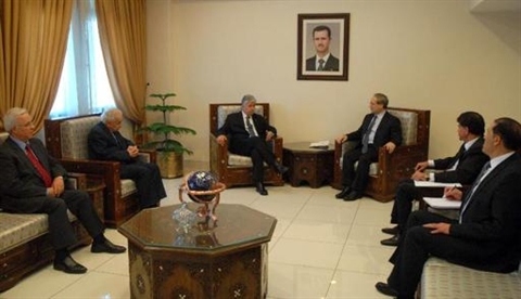 | Le vice-ministre syrien des Affaires étrangères, Faisal Meqdad (3e à droite), rencontre à Damas une délégation de l'OLP, le 7 avril. |
