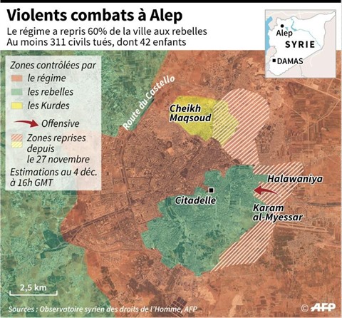 Après avoir repris aux rebelles les quartiers nord d'Alep-est, l'armée et ses alliés tentent désormais de s'emparer des quartiers sud, notamment ceux de Chaar et Cheikh Saïd, où elles livrent combat aux insurgés.