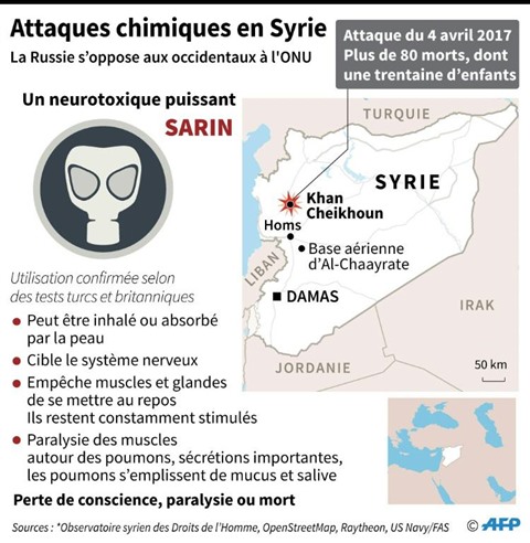 | Localisation des attaques à l'arme chimique contre la ville rebelle de Khan Cheikhoun en Syrie et effets du gaz sarin alors que la Russie s'oppose aux occidentaux à l'ONU. |
