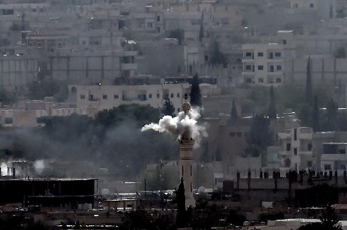 | De la fumée s'élève d'un minaret après une nouvelle salve de bombardements sur la ville kurde de Kobané, le 13 |