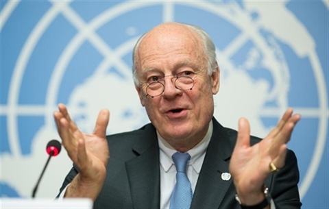 | L'envoyé spécial de l'ONU pour la Syrie, Staffan de Mistura, lors d'une conférence de presse, le 28 avril à Genève, en Suisse. |