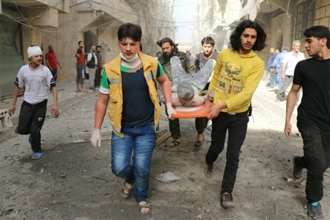 | Des Syriens transportent un blessé après des frappes aériennes contre le quartier de Ferdous à Alep, le 26 avril. |