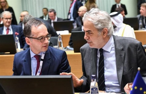 | Le ministre allemand des Affaires étrangères, Heiko Maas (gauche), et le commissaire européen, Christos Stylianides, à une conférence de donateurs pour les Syriens, à Bruxelles le 25 avril. |