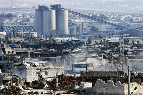 | Des Syriens marchent au milieu des ruines dans un quartier d'Alep, le 17 décembre. |
