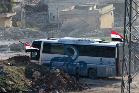 | Un bus au passage de Ramoussa, sous contrôle des forces gouvernementales syriennes dans le sud d'Alep, le 18 décembre dans le cadre d'une opération d'évacuation de civils et de soldats rebelles. |
