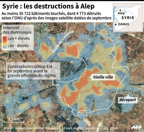 Il resterait environ 40.000 civils et entre 1.500 et 5.000 combattants avec leurs familles dans le réduit rebelle, selon l'émissaire de l'ONU pour la Syrie Staffan de Mistura. Environ 8.500 personnes, selon l'OSDH, avaient pu être évacuées d'Alep avant que les opérations ne soient interrompues en raison de divergences sur le nombre de personnes à évacuer de Foua et Kafraya, assiégées par les rebelles dans la province voisine d'Idleb (Nord-Ouest).