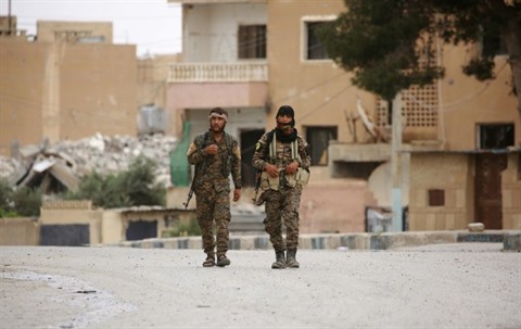 | Des membres des forces démocratiques syriennes (FDS) à Taqba, à l'ouest de Raqa, le 18 mai. |