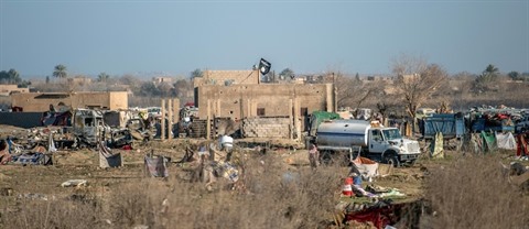 | Le drapeau noir de l'EI flotte au dessus d'un bâtiement dans le village de Baghouz, le 9 mars |