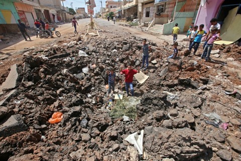 | Des enfants syriens posent pour une photo dans un cratère provoqué par un tir d'obus le 4 juillet à Ghariyah ash Sharqiyah dans la région de Deraa. |