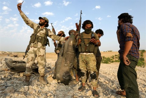 | Des combattants rebelles montrent les débris d'un avion du régime syrien abattu, près de Khan Cheikhoun, le 14 août. |