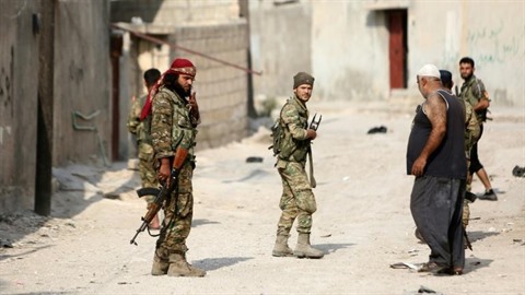 | Des rebelles syriens proturcs photographiés près de la ville de Ras al-Aïn, dans le Nord de la Syrie près de la frontière avec la Turquie, le 19 octobre. |
