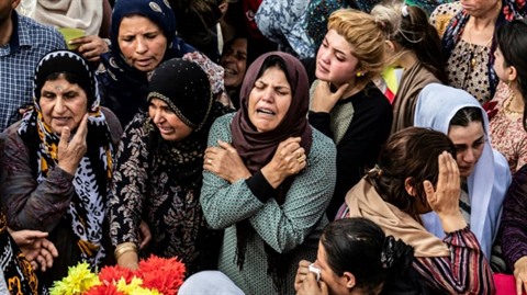| Des femmes pleurent la mort de civils et de combattants kurdes, tués lors de bombardements turcs dans le nord de la Syrie, à Tal Tamr, le 19 octobre. |