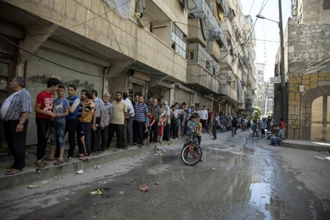 | Des Syriens font la queue pour acheter du pain, le 12 juillet à Alep. |