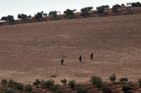 | Des membres présumés du groupe de l'État islamique sur une colline à l'ouest de Kobané, en Syrie le 18 octobre. |