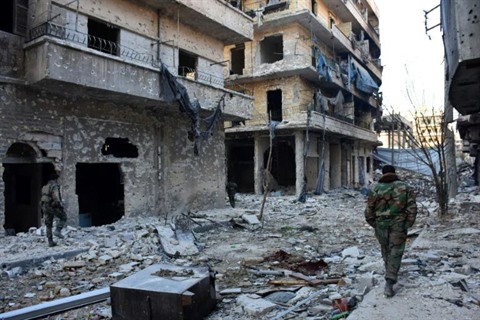 | Des soldats des forces syriennes marchent dans le quartier d'Alep de Bustan al-Basha, le 28 novembre |