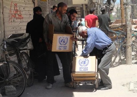 | Des habitants de Yarmuk un camp de réfugiés palestiniens au sud de Damas, récupèrent de l'aide humanitaire, le 14 juillet 2014 Rami Al-Sayed. |