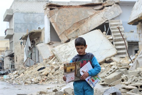 | Un enfant porte des manuels distribués par des volontaires de l’UNICEF à la suite d’une séance d’information sur les engins non explosés à Alep, en Syrie. |