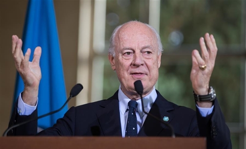 | L'envoyé spécial de l'ONU pour la Syrie, Steffan de Mistura, lors d'une conférence de presse, le 18 avril à Genève. |