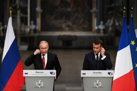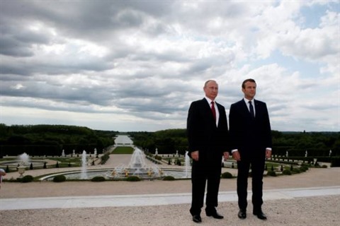 | Vladimir Poutine et Emmanuel Macron à Versailles, le 29 mai. |