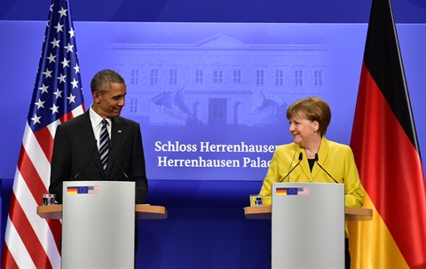 | Barack Obama et Angela Merkel lors d'une conférence de presse, le 24 avril à Hanovre, en Allemagne. |