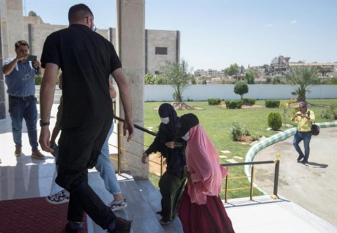 | Des membres des forces de sécurité kurdes accompagnent des membre des familles de combattants du groupe État Islamique avant de les remettre à des diplomates néerlandais dans la ville syrienne de Qamichli le 5 juin. |