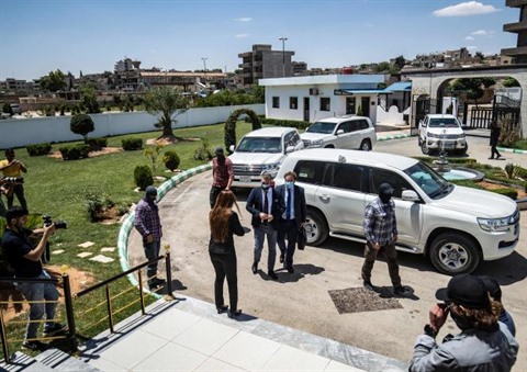 | Des membres des forces de sécurité kurdes surveillent l'arrivée des membres d'une délégation de diplomates néerlandais le 5 juin à Qamichli, dans le Nord-Est de la Syrie. |