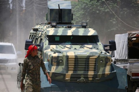 | Un combattant des Forces démocratiques syriennes marche devant un véhicule blindé dans un quartier de Raqa lors de l'offensive contre les jihadistes de l'EI, le 11 juin. |