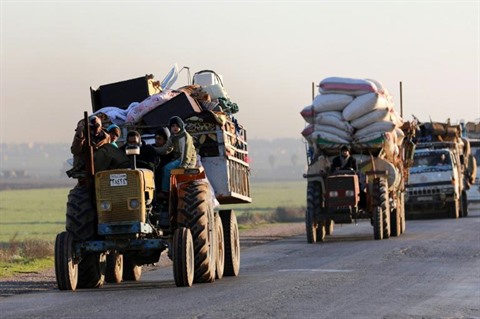 | Des Syriens fuient les combats dans la province rebelle d'Idleb, le 7 janvier près de Saraqeb. |