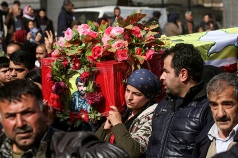 | Des Kurdes syriens participent le 3 février 2018 à Afrine, dans le Nord de la Syrie, à des funérailles de combattants d'une milice kurde tués dans des combats avec des forces pro-Ankara. |