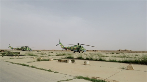 | Des hélicoptères de l'armée syrienne sur la base militaire de Dmeir au nord-est de Damas, le 8 avril 2016. |